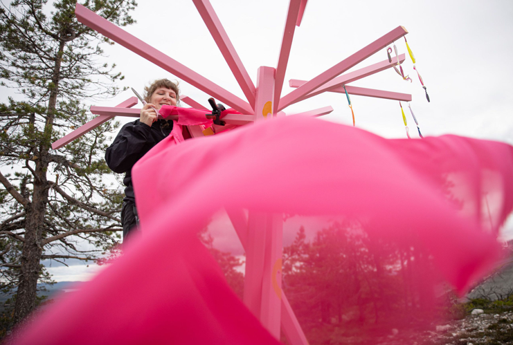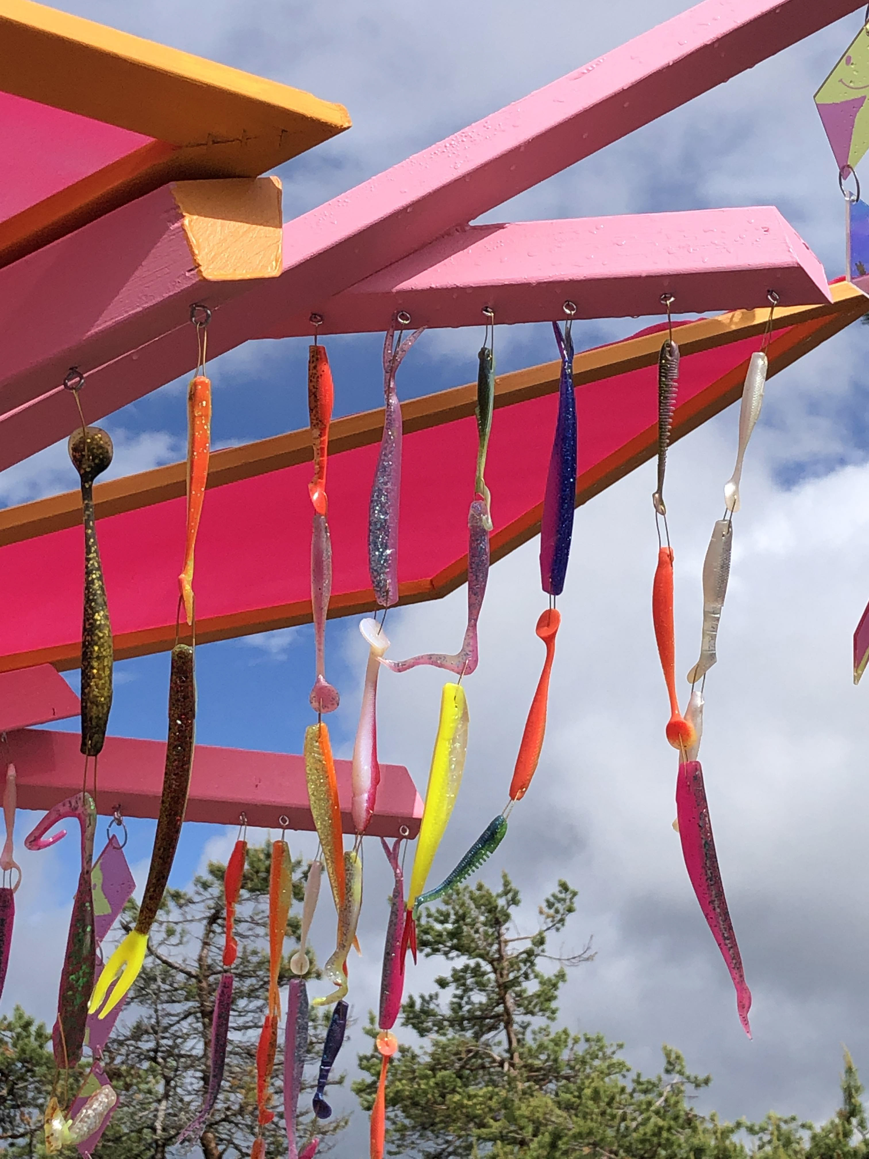 I wanted to create a functional installation on top of Rukatunturi. Sit down, relax and enjoy the amazing view. The vibrant colors of fishing jigs and pink fabric came alive the solstice sunlight.